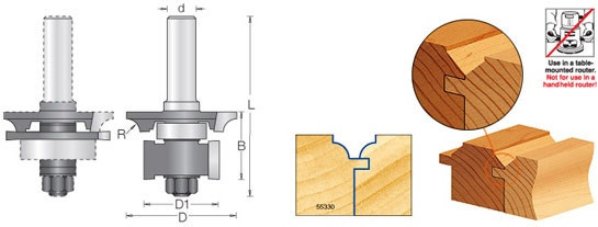This pattern is a 1/4″ bead (#55330), a 45° ‘V’ (#55320) is also available individually or as a set (#55325).Each assembly comprises a profile cutter, a rabbet cutter and a groovecutter, two different-size bearings, a 1/2″ shank arbor, a selection ofwashers, shims and spacers.