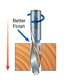 Down spiral bits are a great choice for grooves and dadoes in single-sided veneers and laminates where chip removal is not a problem, or for through-cuts where finish quality on the top surface is the primary consideration. Also cuts well in solid wood. Ideal for use in CNC routers. When used in hand-held or table-mounted routers, use care to keep router and work piece under control.